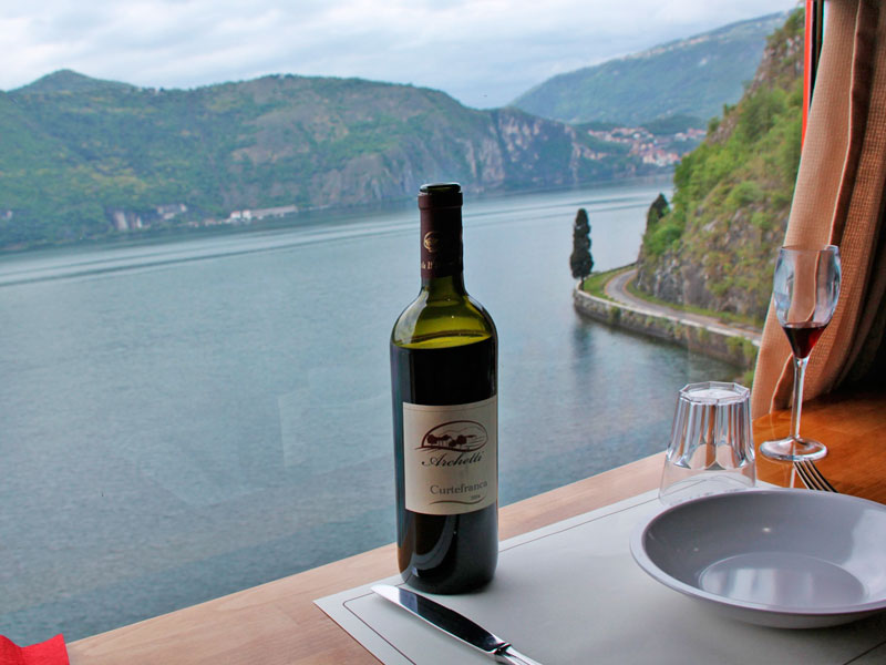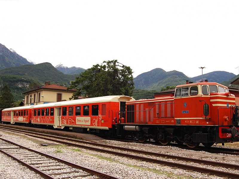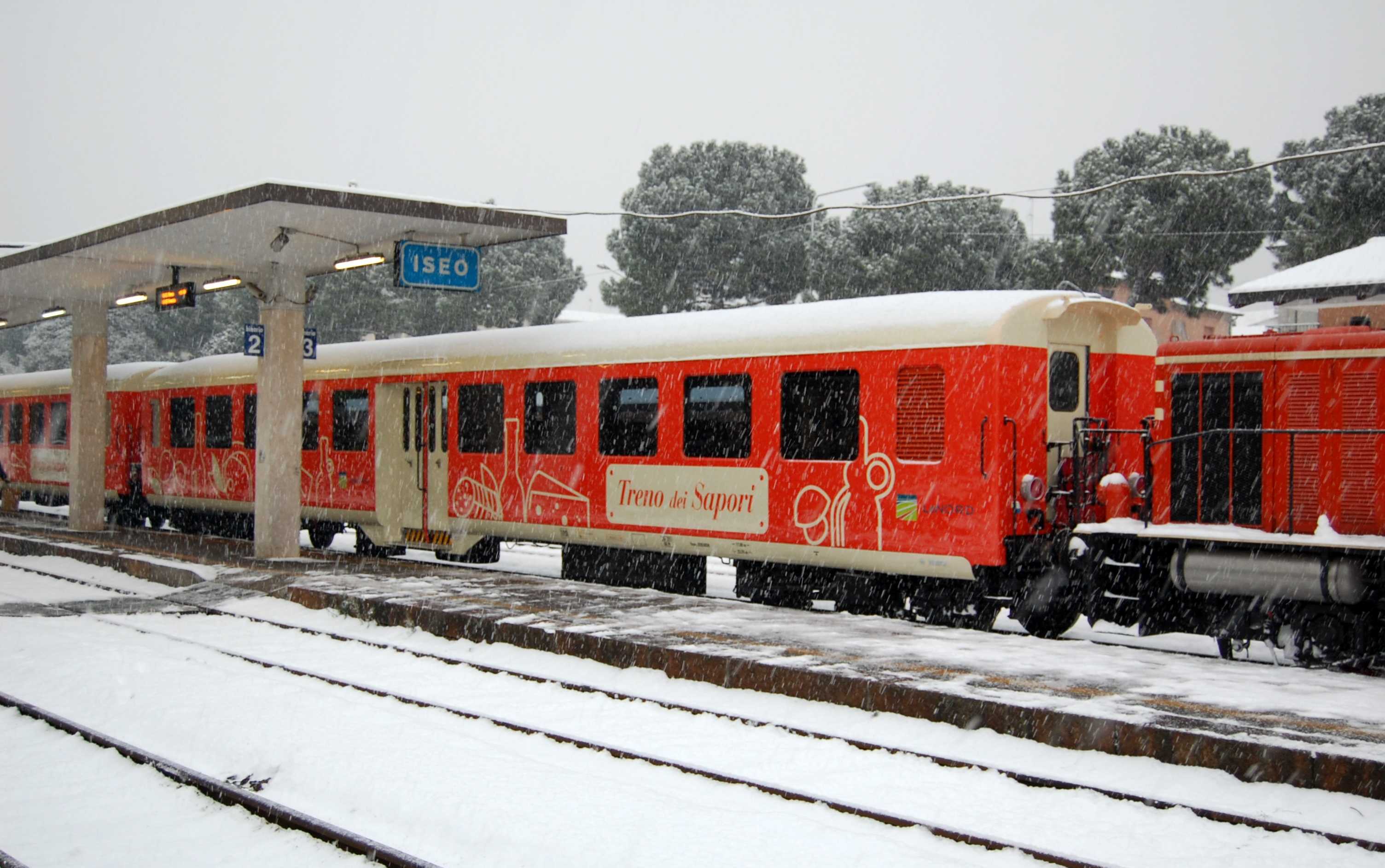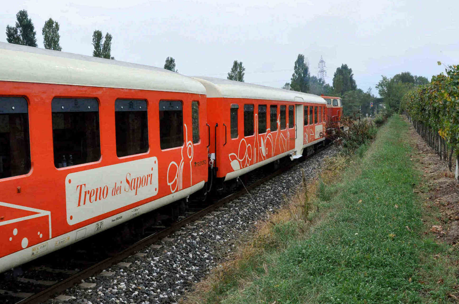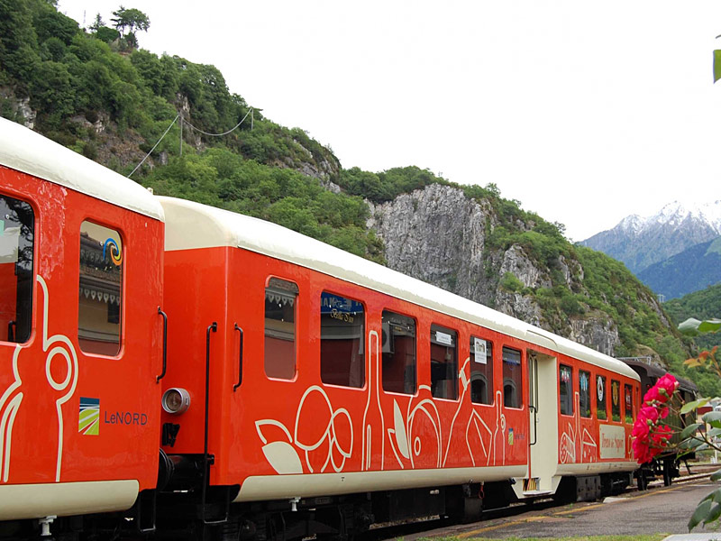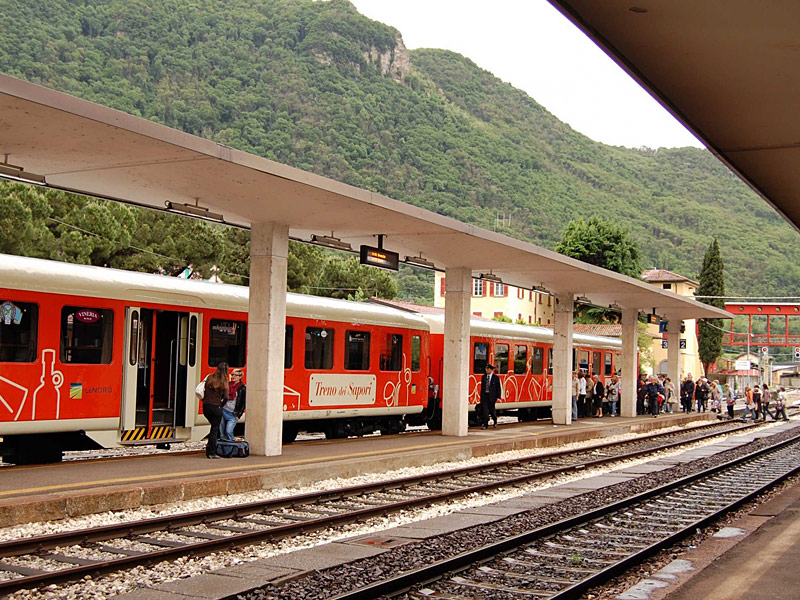 “Treno dei Sapori” is a new and innovative means of transport, wanted and funded by Trenord. The train is composed by two orange wagons towed by a diesel electric locomotive. It has been created in order to promote the region of Franciacorta, lake Iseo and Camonica Valley, along the railway line Brescia-Edolo.